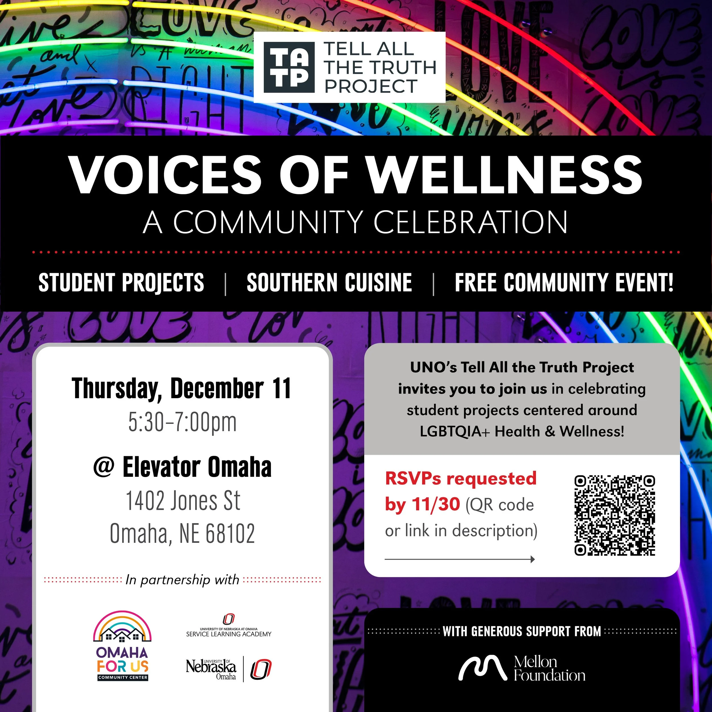 UNO’s Tell All the Truth Project invites you to join us in celebrating our students’ work and our community partners. Students enrolled in “Publishing the Linden Review” and “LGBTQ+ Health” have been collaborating with Omaha For Us and will be showcasing a wide range of creative projects designed to increase awareness about LGBTQIA+ health and wellness topics.